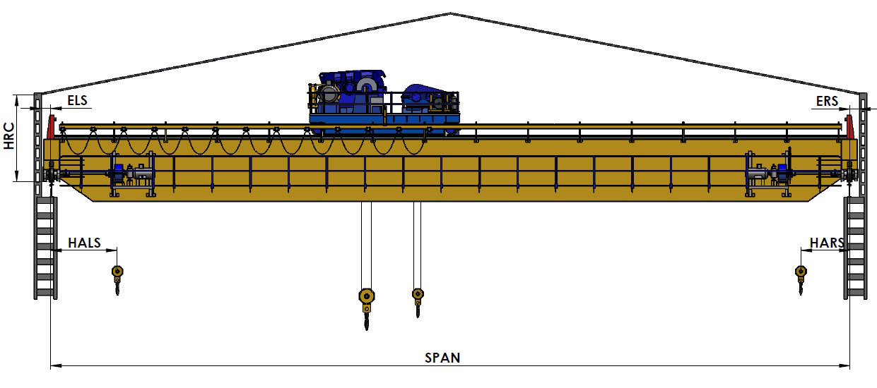 | Capacity in Tons | Span in Metres | Head Room Clearance in mm HRC | Hook approach in mm HALS | Hook approach in mm HARS | End Clearance in mm ELS/ERS | Wheel Base in mm | Total Wt. of Crane in tons (approx.) | Wheel load of crane in tons (approx.) |